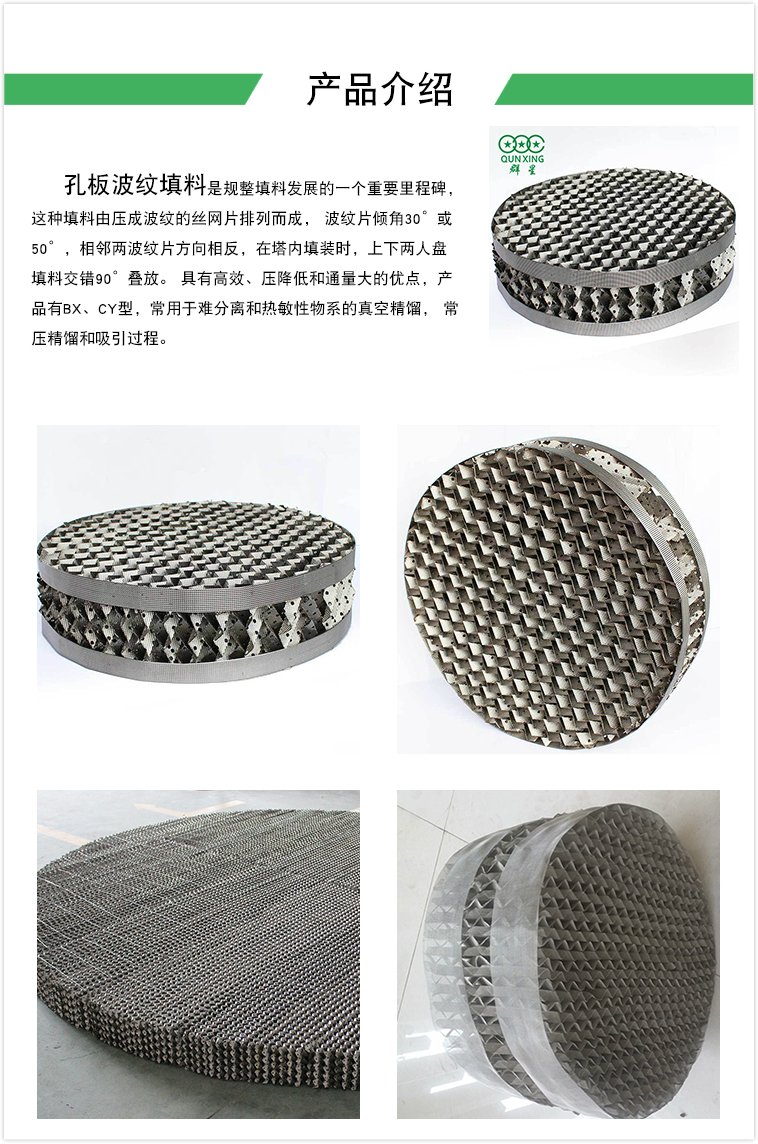 重點(diǎn)介紹金屬絲網(wǎng)波紋包裝,它是波紋包裝的主要方式,主要由金屬絲網(wǎng)制成,較常用的有不銹鋼、碳鋼、鋁、銅等,當(dāng)然也可根據(jù)客戶需要選擇其他材料。雖然波紋金屬絲網(wǎng)填料的成本相對(duì)較高,但由于其分離能力強(qiáng)、比表面積大、空位率高、阻力小等優(yōu)點(diǎn)而得到廣泛應(yīng)用,特別是用于精細(xì)蒸餾和真空蒸餾設(shè)備,以及熱敏性材料的蒸餾。